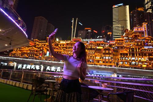 随着夜幕降临,重庆的消费图景继续向立体空间拓展。“种草官”们从两江游轮仰望洪崖洞璀璨灯火,在520米高空俯瞰万家星光,夜经济正从水面延伸至云端。“两江游”夜班航班贡献超95%接待量,高空观景台单日涌入五万人。“种草官”周晓萱感叹:“在旋转酒吧听着爵士喝夜啤酒,这种体验只有重庆能给。”