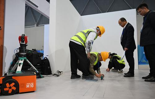 ▲图为工程测量比赛现场,技术人员正在操作机器人用红外线对房屋进行检测。 记者罗斌 摄/视觉重庆