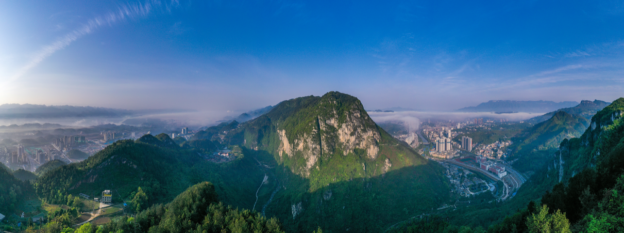 从万米高空俯瞰,莽莽武陵山区,重庆市黔江区域内,灰千梁子、五福岭、麒麟盖、八面山、三塘盖、贾角山六大山体绵延壮阔,山与山之间形成峡谷。