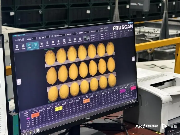 尚未进入分拣柠檬的自动化工厂,南都记者就已经能闻到一股强烈的柠檬香气。不远处一批批鲜黄的柠檬正被传送入厂,连接传送系统的电脑屏幕上快速显现出每一个柠檬的“证件照”,这是蜜雪冰城的工厂在运用高速红外相机、高清摄像机和动态称重系统等手段筛选出高标准的商品果。