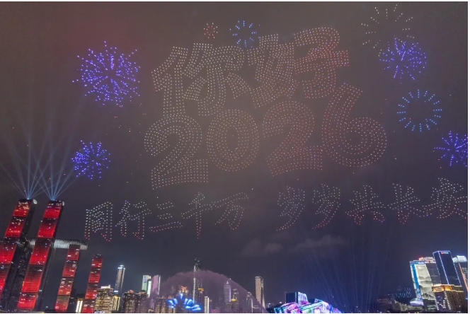 新年前夕,国家主席习近平发表的二〇二六年新年贺词中,特别提到了“无人机演绎绚丽‘烟花’”。这既是对科技与艺术融合创新的高度肯定,也象征着新时代中国蓬勃向上的生机与活力。