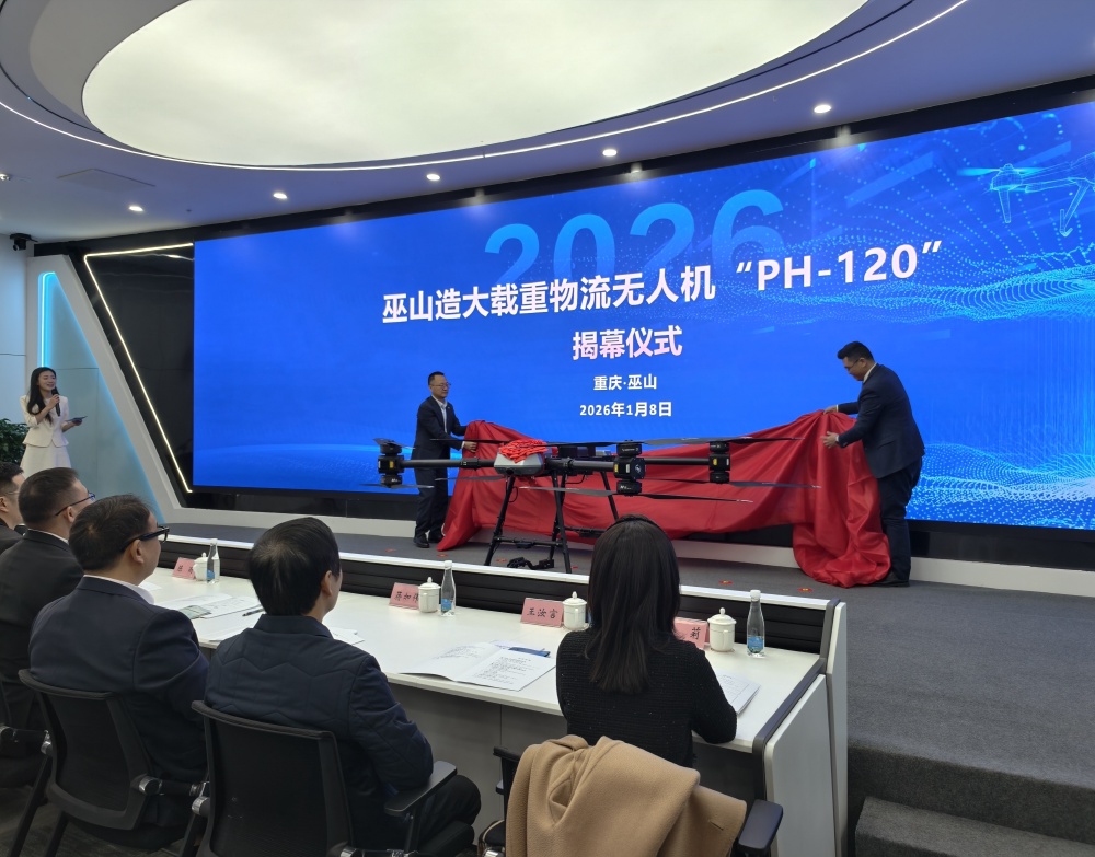 1月8日,在巫山县低空服务运营指挥中心,当红布慢慢掀开,“巫山造”首台纵横PH-120大载重物流无人机正式“亮相”。