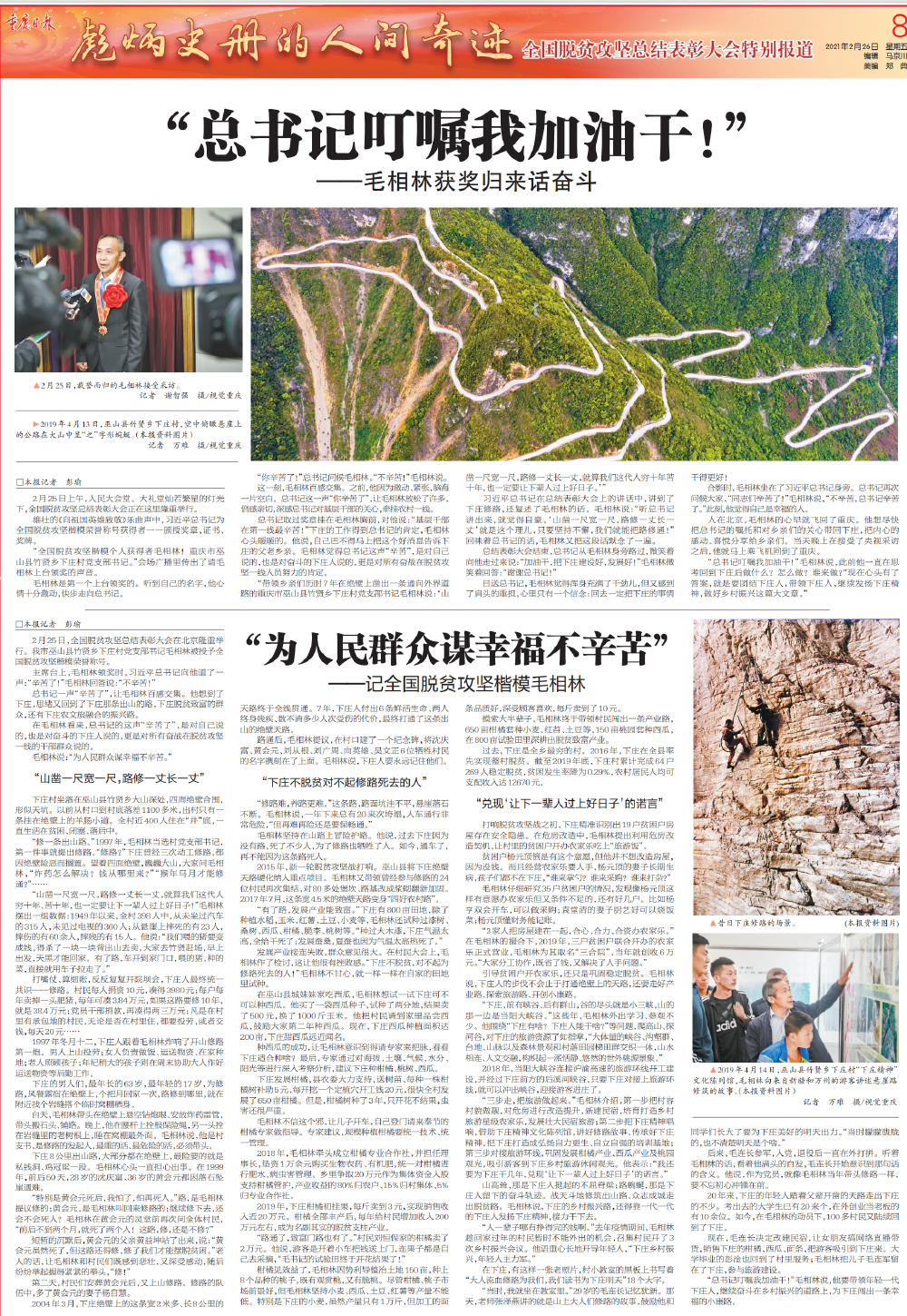 ▲2021年2月26日重庆日报对毛相林获奖的整版报道。